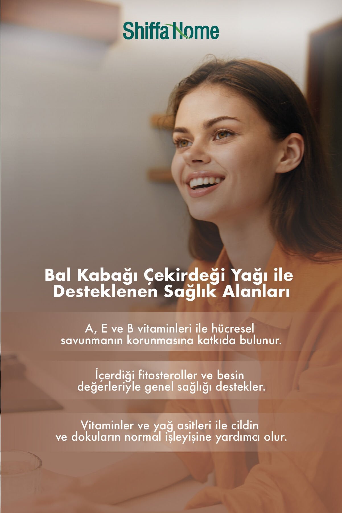 Bal kabağı çekirdeği yağı, tamamen soğuk sıkım yöntemiyle üretilen ve içerisinde önemli vitamin ve mineraller barındıran katkısız bir yağdır. Shiffa Home Bal kabağı çekirdeği yağını kullanımı kolay hale getirilmek için helal sertifikalı sığır jelatinde sunmaktadır.