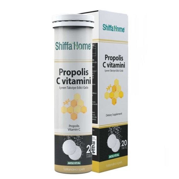 Shiffa Home Propolis C Vitamini Efervesan içerisinde; C Vitamini, Söğüt Kabuğu Ekstresi ve Propolis Ekstresi bulunduran tamamen doğal ürünlerin yüksek teknolojiyle bir araya getirildiği, sizi daima güçlü hissettirecek besin değeri yüksek gıda takviyesidir. Doğal ürünler insan kimyasıyla tam uyumu sebebiyle sağlıklı yaşamın anahtarıdır. Propolis içerisinde, reçine, balmumu, yağ asitleri, uçucu yağlar, enzimler, flavanoidler, polifenoller, polen, vitamin ve mineraller barınır.