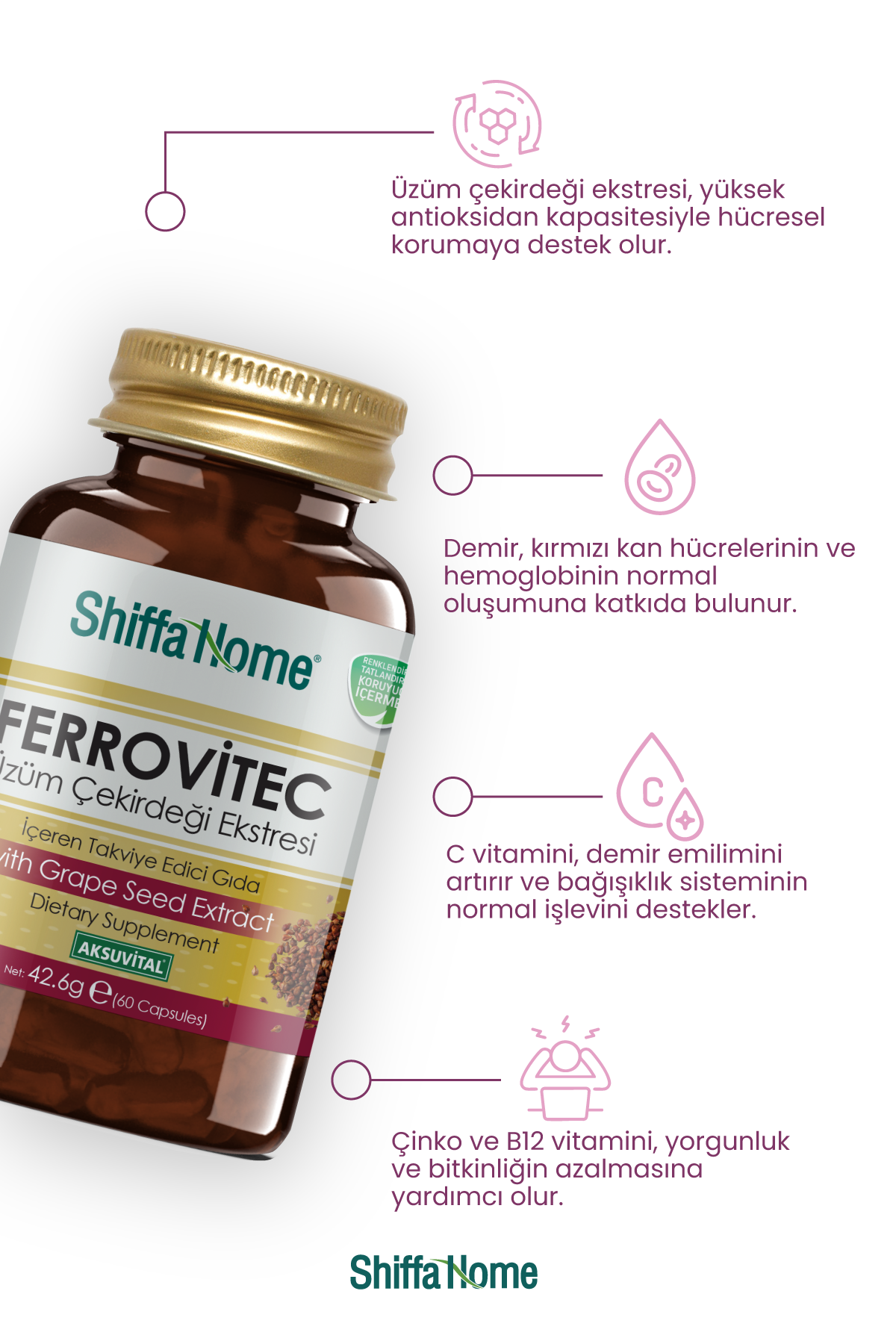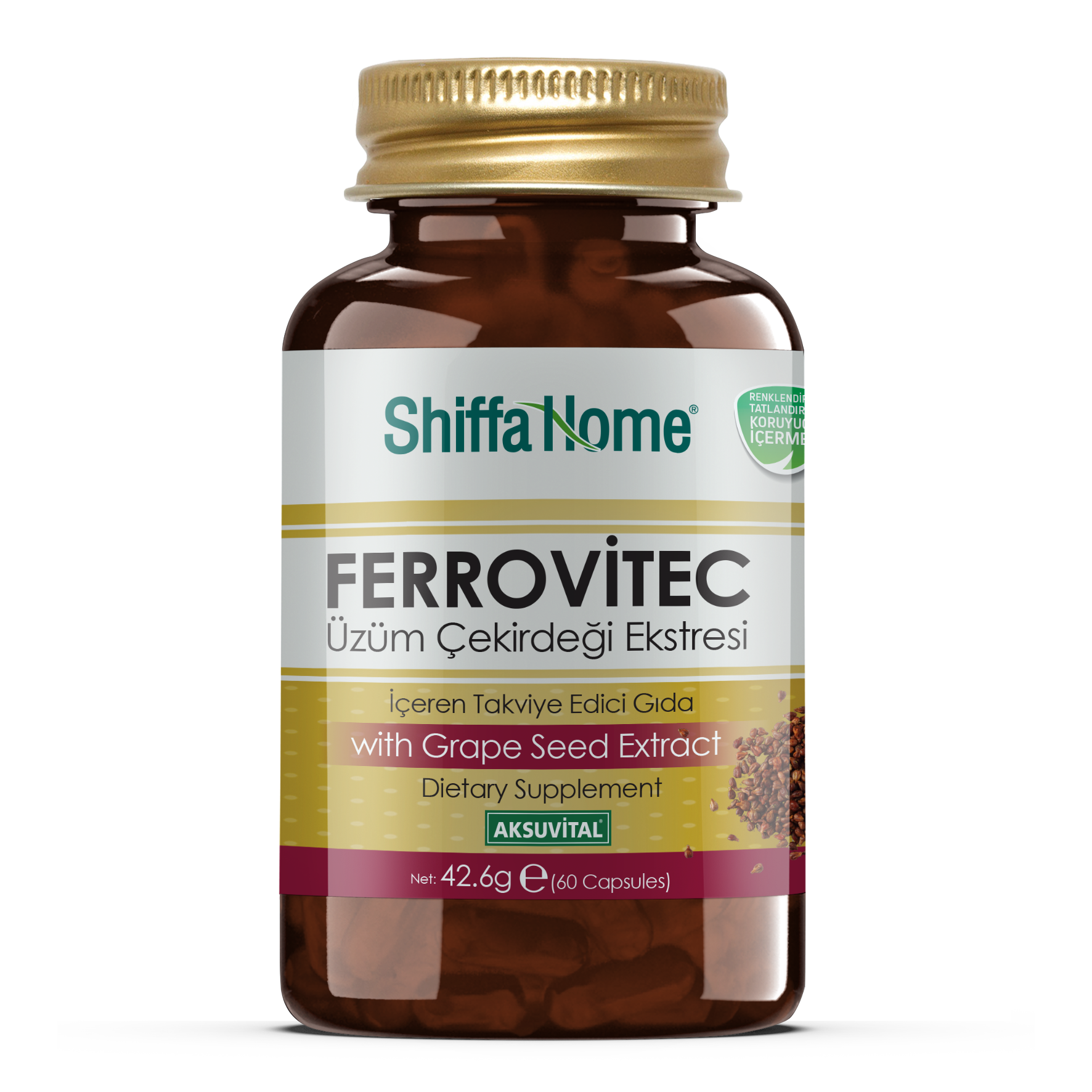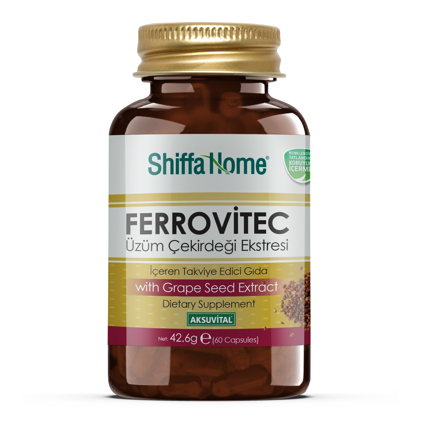Ferrovitec kapsül; 85 mg Üzüm Çekirdeği Ekstresi, 85 mg Çemen Tohumu, 85 mg Kuşburnu Meyvesi, 48 mg C Vitamini, 48mg L-Askorbik Asit, 40 mg Alıç Yaprağı, 40 mg Melisa Yaprağı, 40 mg Isırgan Yaprağı, 40 mg Biberiye Yaprağı, 40 mg Adaçayı Yaprak, Demir 14 Mg-% GKM: 100, Çinko 8 Mg, Folik Asit 200 ve 2,5 mcg B12 Vitamini içeren doğal ve yüksek teknoloji ile üretilen besin değeri yüksek ve daima sizi zinde hissettirecek bir gıda takviyesidir. Doğal ürünler insan kimyasıyla tam uyumu sebebiyle sağlıklı yaşamın anahtarıdır.