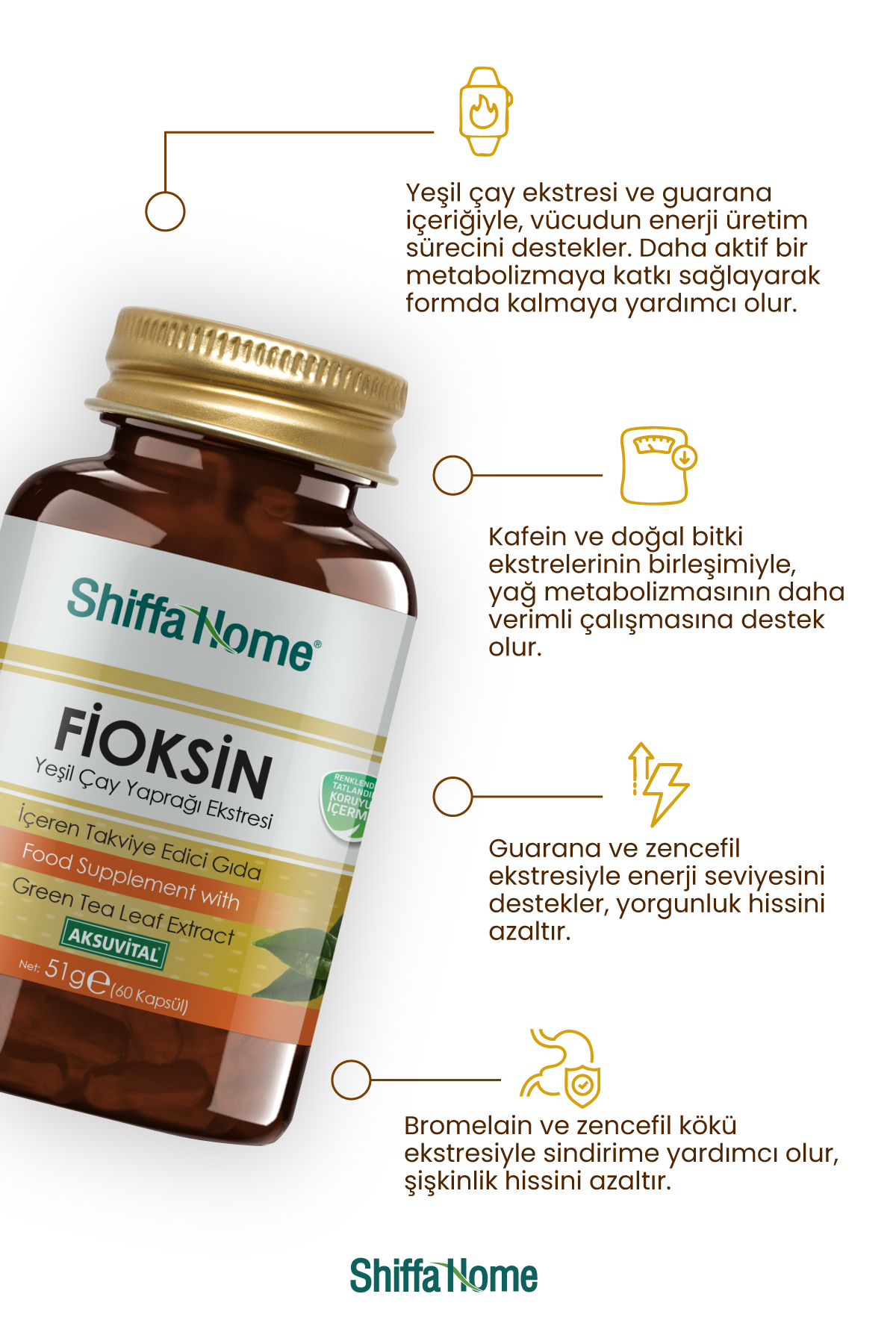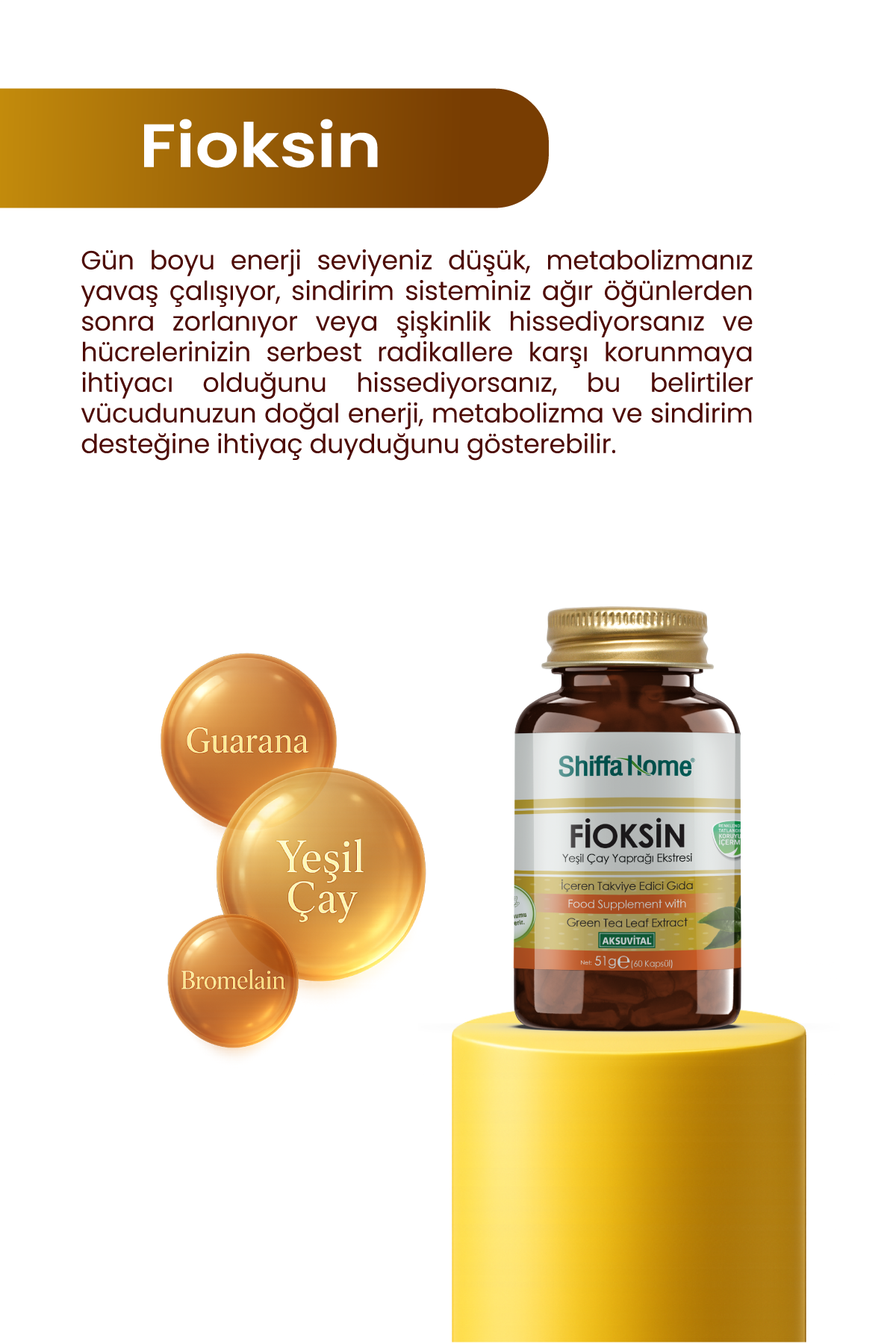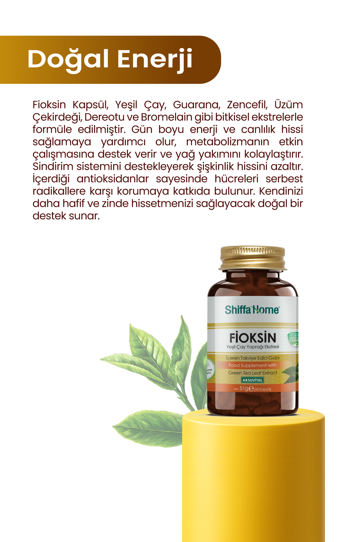 Fioksin kapsül (2 kapsül); Yeşil Çay Yaprağı Ekstresi 300 mg, Kafein 200 mg, Üzüm Çekirdeği Ekstresi 200 mg, Guarana Tohumu Ekstresi 200 mg, Zencefil Kökü Ekstresi 200 mg, Dereotu Tohumu 200mg, Bromelain 120 mg bulunduran, tamamen doğal ürünlerin yüksek teknolojiyle bir araya getirdiği fitoks kapsül, sizi daima zinde hissettirecek gıda takviyesidir. Doğal ürünler insan kimyasıyla tam uyumu sebebiyle sağlıklı yaşamın anahtarıdır.