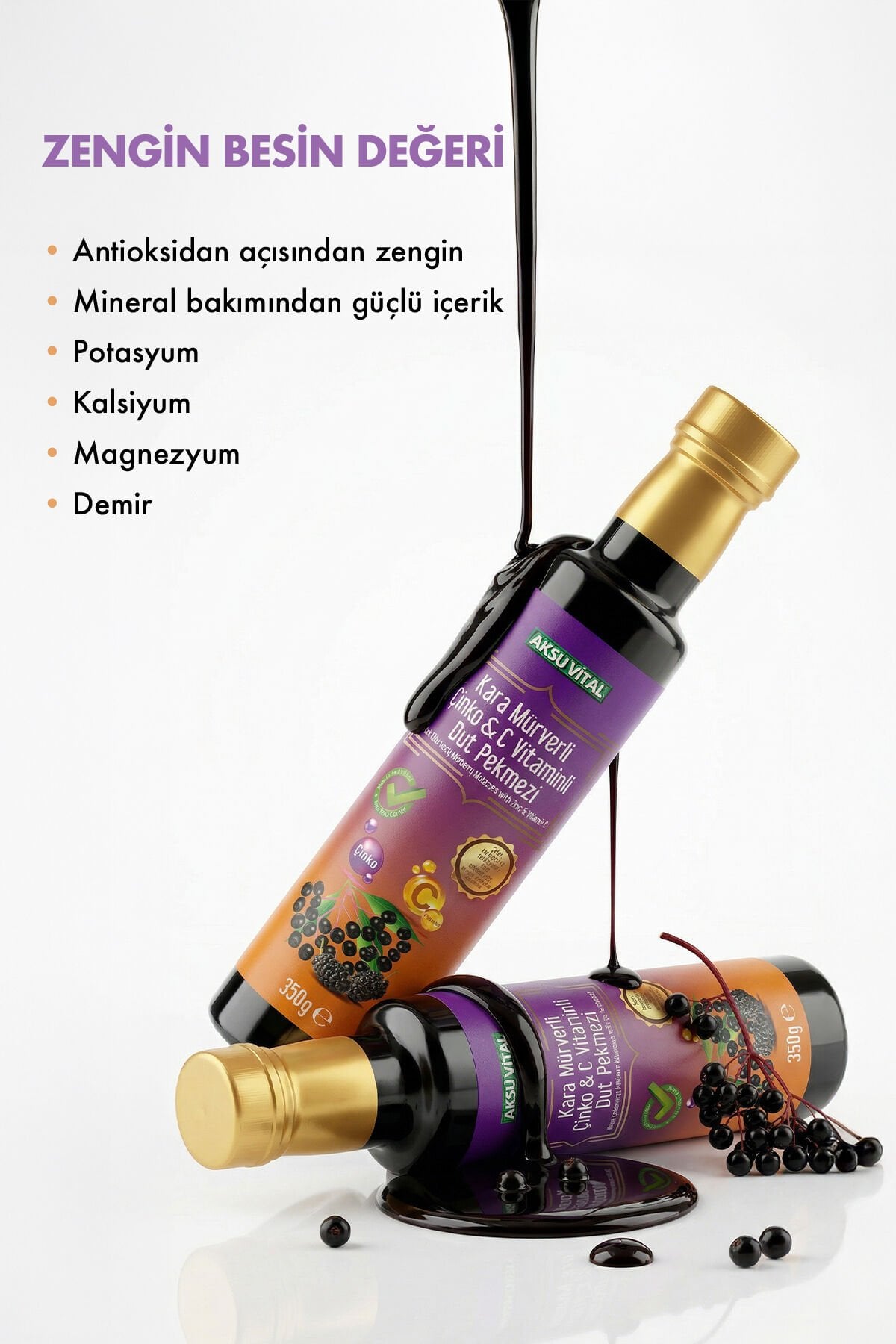 AKSUVİTAL Kara Mürverli Çinko C Vitaminli Dut Pekmezi 350 gr, bir çoğunluğu başta Malatya olmak üzere Erzincan, Erzurum, Elazığ ve Adıyaman bölgelerinde yetiştirilen dutların toplanarak 70 dereceyi geçmeyen kazanlarda vakumlama sistemi ile elde edilen bir pekmezdir. AksuVital pekmezlerinin üretiminde, kullanılan meyvenin çeşidine bağlı olarak az da olsa farklı teknikler kullanılmaktadır ve kaliteli dut pekmezi, Türk Gıda Kodeksinde belirlenen tekniğine uygun ve hijyenik şekilde üretim, hazırlama, işleme, muhafaza, depolama ve taşıma ile tüketici ile buluşturulmaktadır.