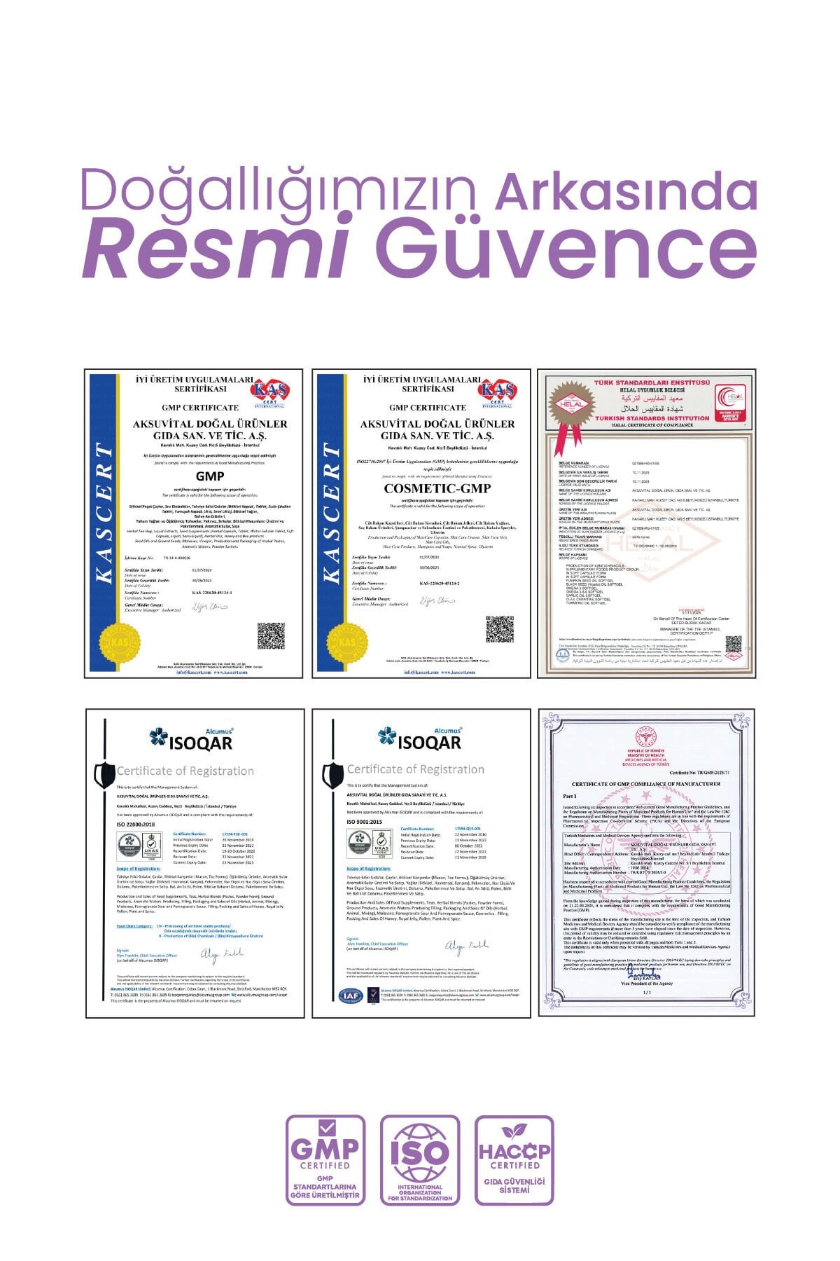- Üretim tesisimizde ISO 22000:2005, ISO 9001:2015 ve Helal standartları uygulanmaktadır.