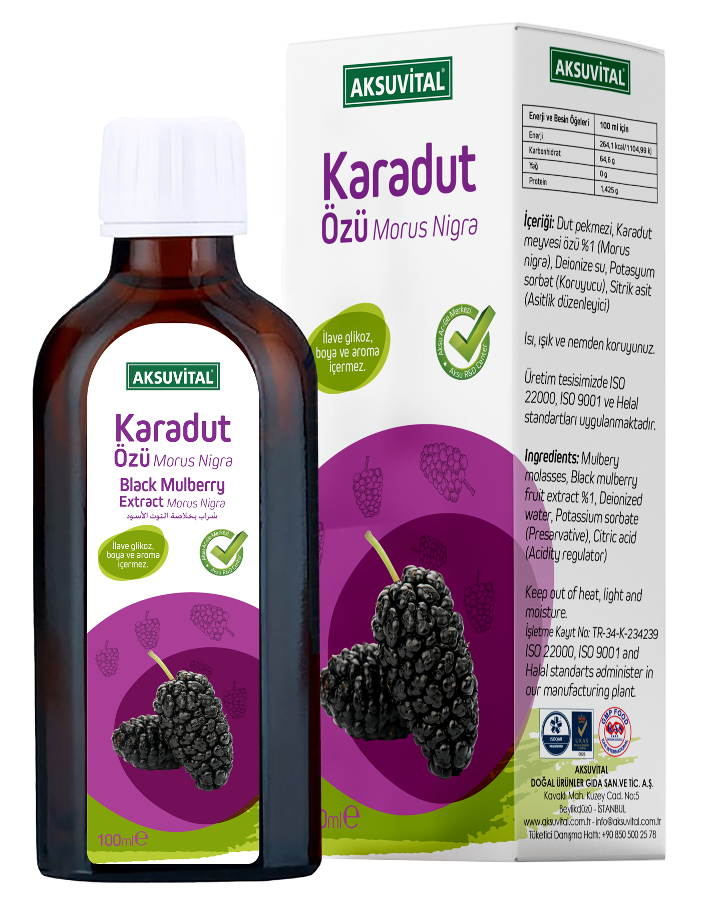 İçerik: Dut pekmezi, Karadut özü, Deionize su, Potasyum sorbat(Koruyucu), Sitrik asit (Asitlik düzenleyici)