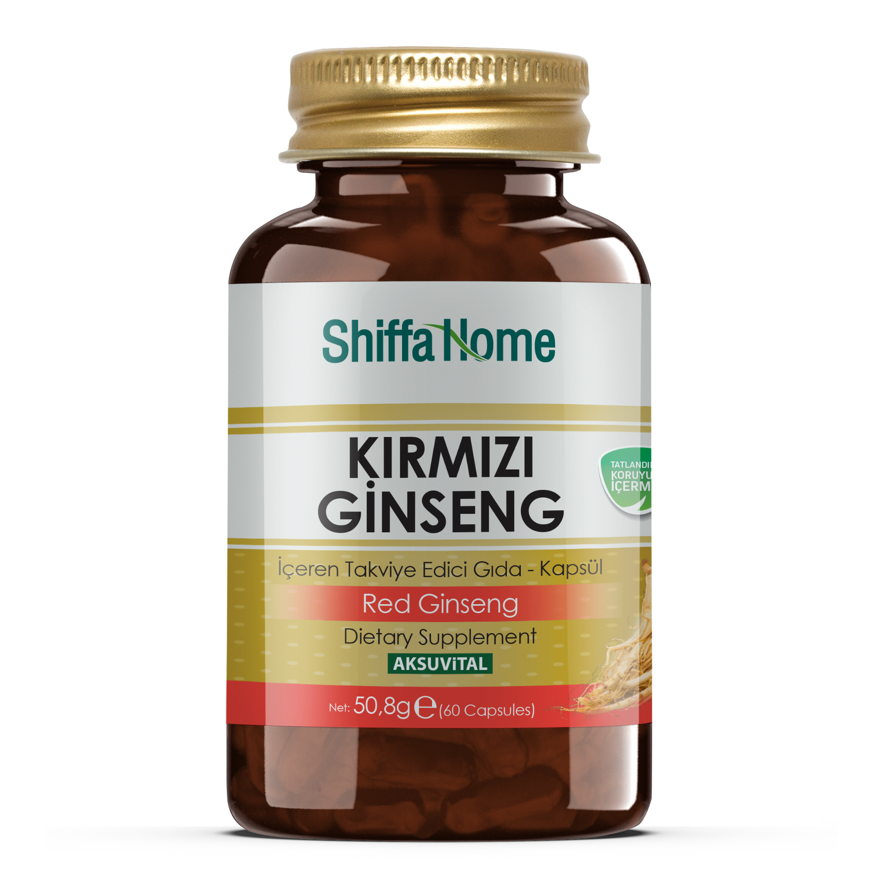 İçerik: 2 kapsülde; Kırmızı Ginseng (kök) 1700 mg (panax ginseng), Bitkisel Kapsül (hidroksipropil metil selüloz), Kırmızı Ginseng (kökü) ekstresi 140 mg (panax ginseng)