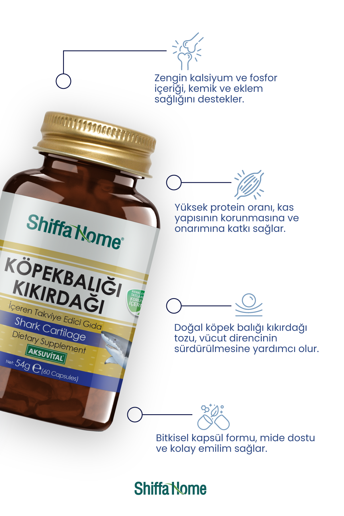 Köpek balığı kıkırdağı kapsülün içinde yüksek oranda protein, kalsiyum ve fosfor bulunur.