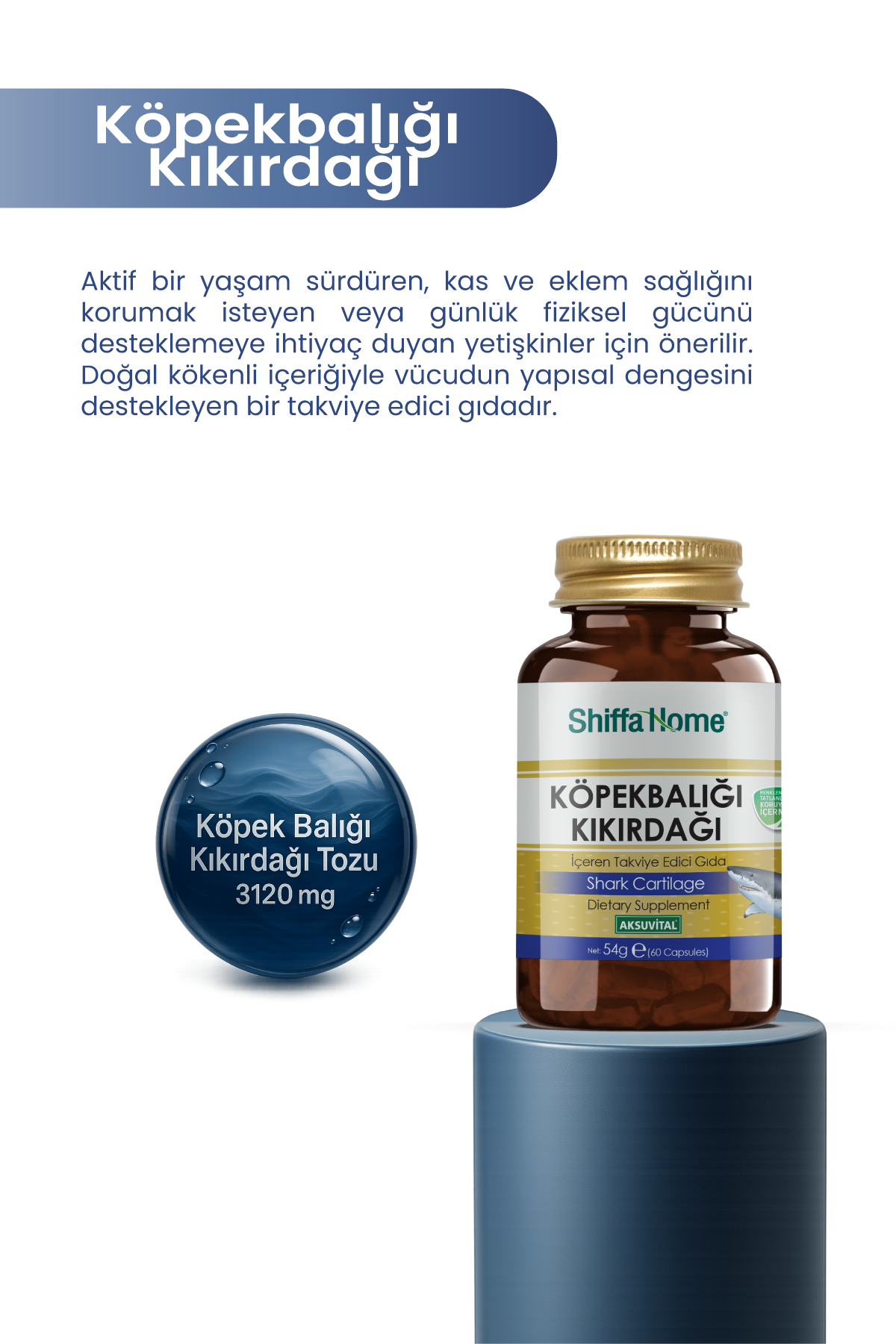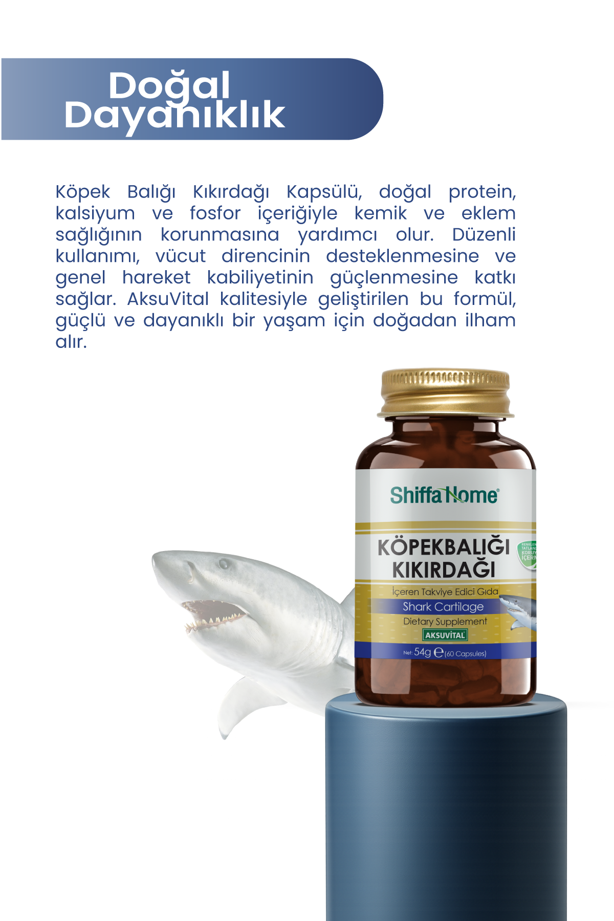 Köpek balığı kıkırdağı içinde (4 kapsülde); 3120 mg köpek balığı kıkırdağı tozu bulunduran, tamamen doğal ürünlerin yüksek teknolojiyle bir araya getirildiği, sizi daima güçlü hissettirecek besin değeri yüksek gıda takviyesidir. Doğal ürünler insan kimyasıyla tam uyumu sebebiyle sağlıklı yaşamın anahtarıdır.