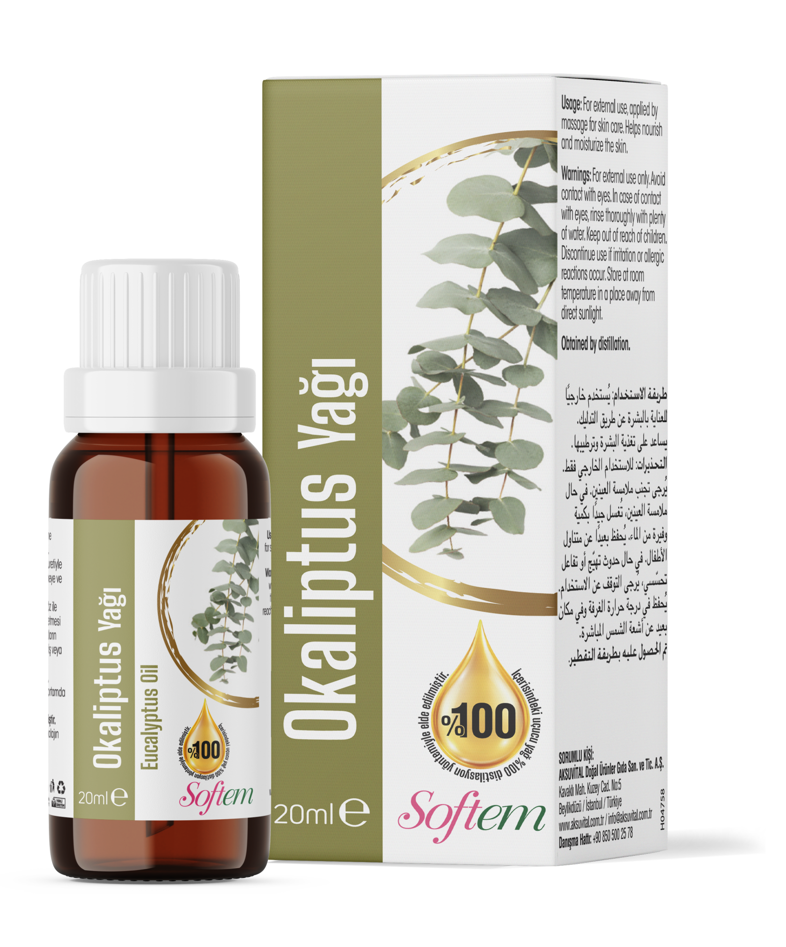 Okaliptüs yağı 20ml, okaliptüs ağacının taze yapraklarından distilasyon yöntemi ile elde edilen oldukça kıymetli uçucu bir yağdır. Yaprak- larında uçucu yağ, reçineler, acı madde ve sineol, kamfen, pinen ve terpineol etken maddeleri vardır.
