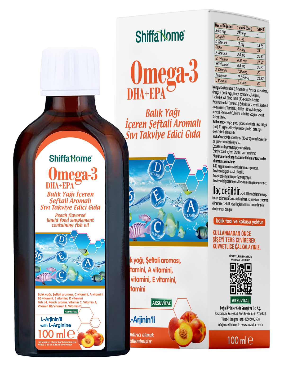 Omega- 3 Dha-Epa Balık, çocukların ve yetişkinlerin normal zihin gelişimi, göz gelişimi ve kalp damar sağlığının korunmasına katkıda bulunan doğal bir sıvı besin takviyesidir. Kullanımı lezzetli hale getirmek için şeker yerine şeftali ve portakal konsantresi ile tatlandırılmaktadır.