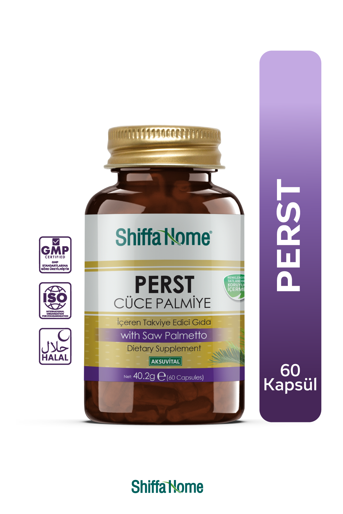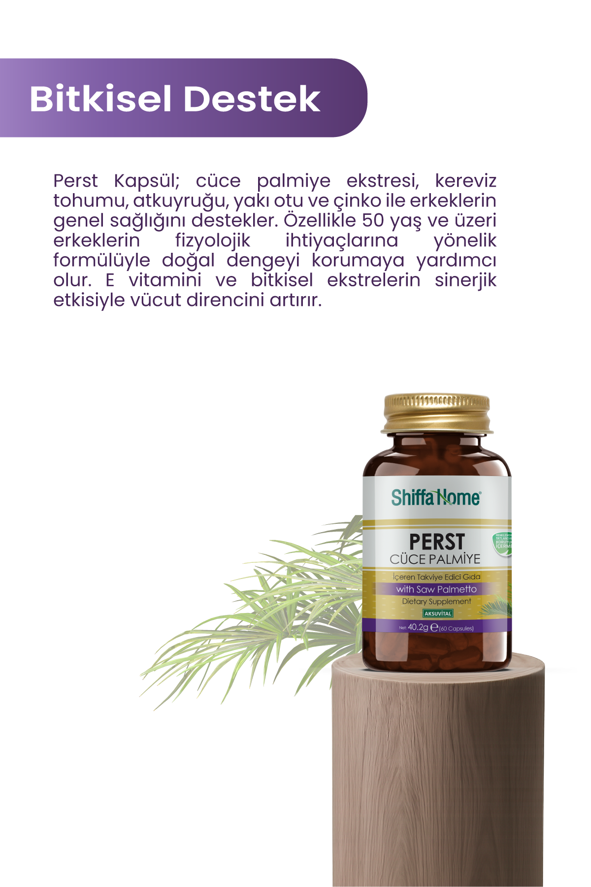 Perst kapsülün içinde; Atkuyruğu Toprak üstü, Kereviz Tohumu, Cüce Palmiye Meyvesi Ekstresi, Yakı Otu Toprak üstü, Servi Kozalağı, Ayrıkoturizomu, Üzerlik Tohumu, Altınotuçiçeği, Ayrıkoturizomu Ekstresi, Çinko, Vitamin E bulunduran, tamamen doğal ürünlerin yüksek teknolojiyle bir araya getirildiği, sizi daima güçlü hissettirecek gıda takviyesidir. Doğal ürünler insan kimyasıyla tam uyumu sebebiyle sağlıklı yaşamın anahtarıdır. Kapsüllerimiz tamamen bitkisel kökenlidir. Hayvansal hiçbir bileşik içermez. Midede 8-10 dakika içerisinde çözünmektedir.