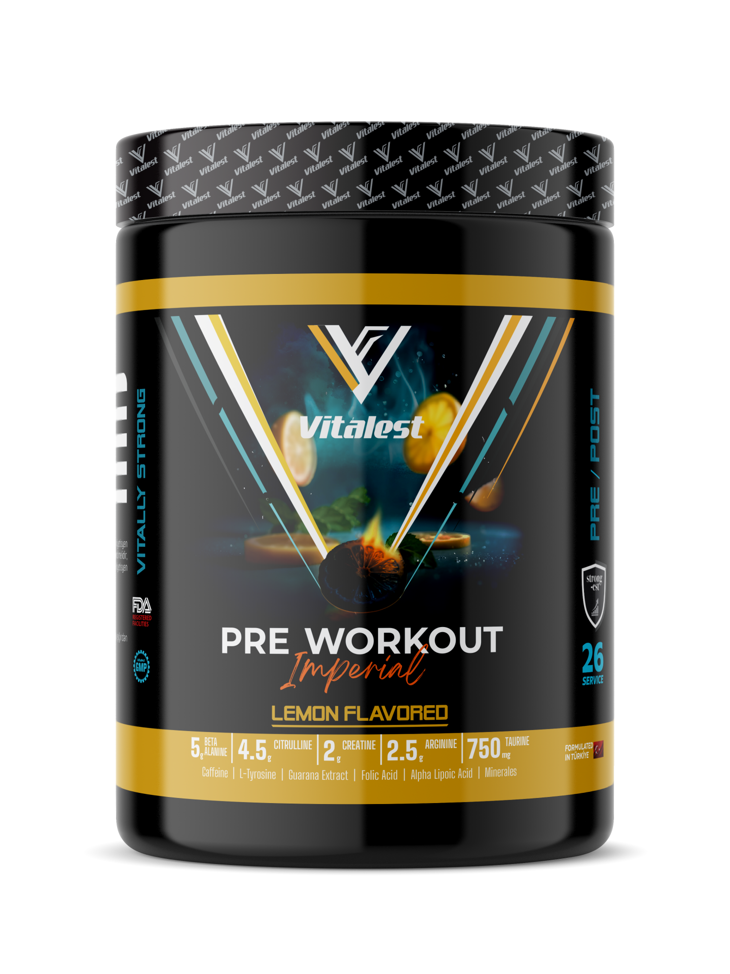Vitalest Pre-Workout Imperial, yüksek yoğunluklu antrenmanlar için tasarlanmış gelişmiş bir performans formülüdür. Her serviste 5 g Beta-Alanine, 4.5 g Citrulline ve 3 g Kreatin içerir. 250 mg Kafein, 100 mg Guarana ekstresi ve 150 mg Tirozin ile mental odaklanmayı destekler. Arginine AKG ve Taurine ile antrenman boyunca kan akışını ve kas dayanıklılığını artırır.